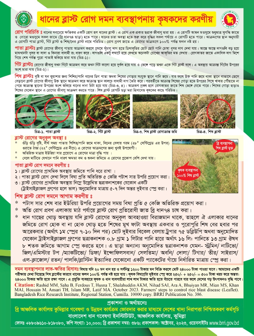 | ১০. | ধানের ব্লাস্ট রোগ দমনে কৃষকদের করণীয় | অক্টোবর ২০২৩ | ডাউনলোড |