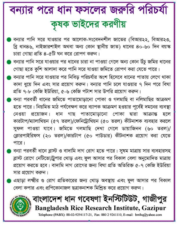 | বন্যার পরে ধান ফসলের জরুরী পরিচর্যা-(দৈনিক ইত্তেফাক-০২/০৯/২০১৪) |