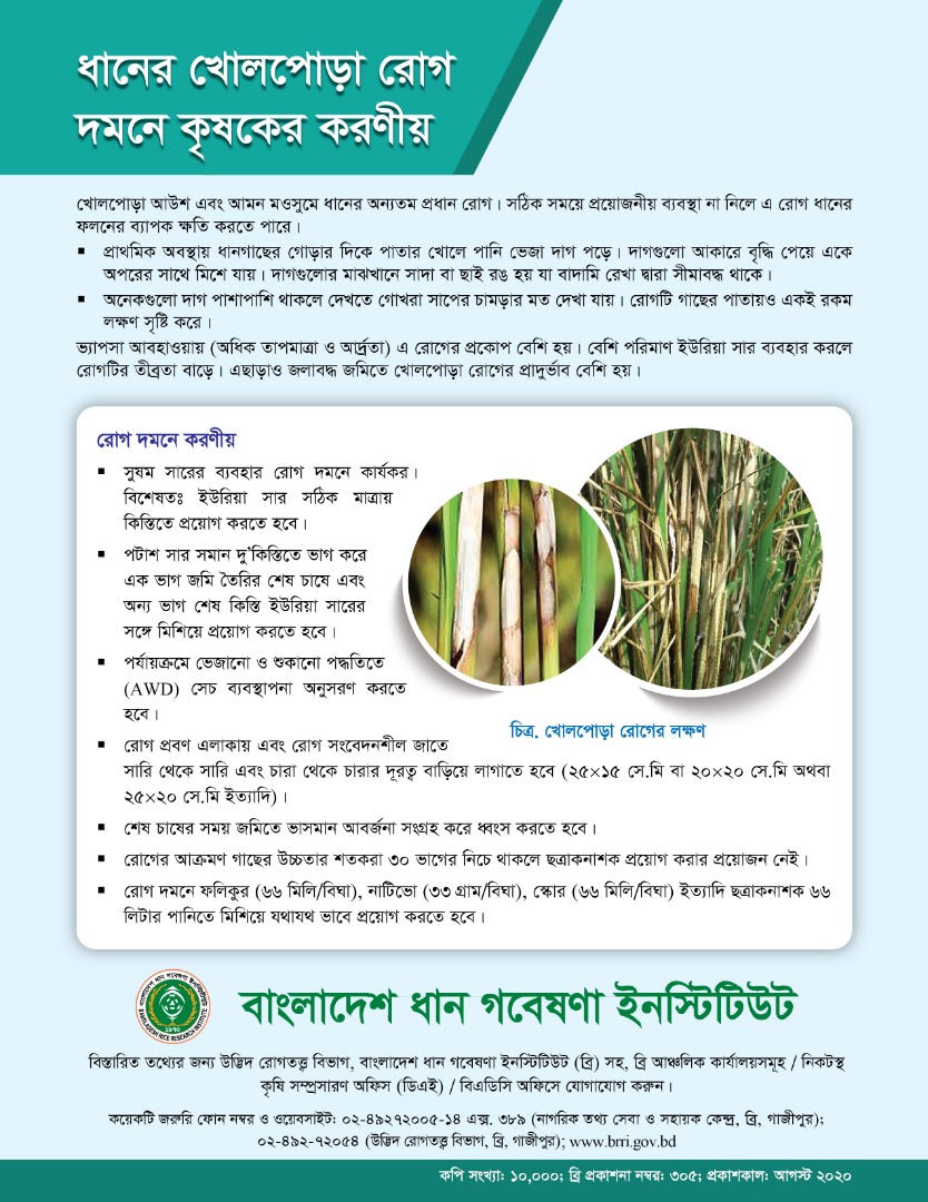 | ০৮. | ধানের খোলপোড়া রোগ দমনে কৃষকের করণীয় | আগস্ট ২০২০ | ডাউনলোড |