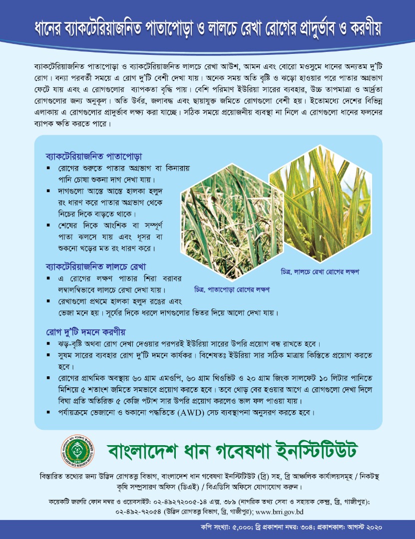 | ০৯. | ধানের ব্যাকটেরিয়াজনিত পাতাপোড়া ও লালচে রেখা রোগের প্রাদুর্ভাব ও করণীয় | আগস্ট ২০২০ | ডাউনলোড |